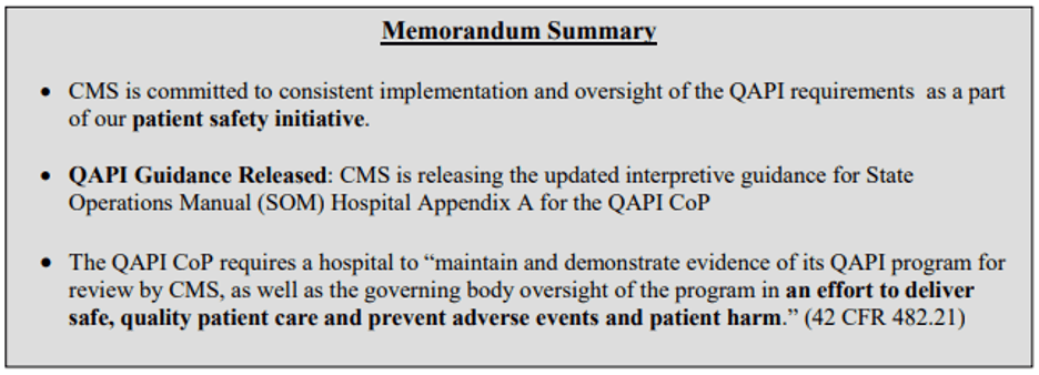 The initial 4-pages of this document are the Memorandum with the remaining 17 pages are the CMS Condition of Participation, Hospital Appendix A – QAPI Guidance Updates.