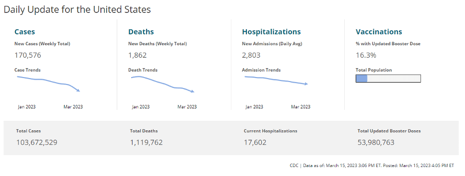 The CDC COVID Daily Data Tracker shows this information for late afternoon on Thursday, March 15, 2023:
