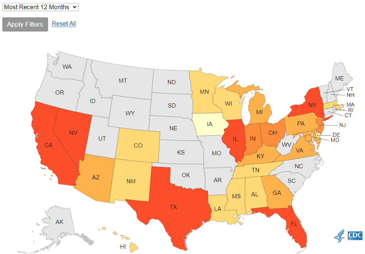 As further explained in the article, C. auris has spread in the United States since it was first reported in 2016, with a total of 3,270 clinical cases (in which infection is present) and 7,413 screening cases (in which the fungus is detected but not causing infection) reported through December 31, 2021. Clinical cases have increased each year since 2016, with the most rapid rise occurring during 2020-2021. CDC has continued to see an increase in case counts for 2022. During 2019-2021, 17 states identified their first C. auris case ever. Nationwide, clinical cases rose from 476 in 2019 to 1,471 in 2021. Screening cases tripled from 2020 to 2021, for a total of 4,041. Screening is important to prevent spread by identifying patients carrying the fungus so that infection prevention controls can be used.