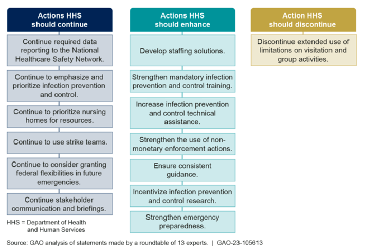 The expert roundtable GAO convened identified actions aimed at improving infection prevention and control in nursing homes, including six actions HHS should continue, seven it should enhance, and one it should discontinue.