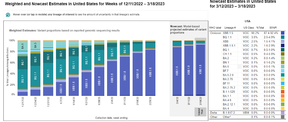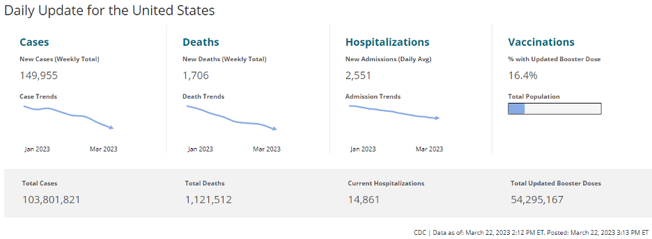 The CDC COVID Daily Data Tracker shows this information for late afternoon on Thursday, March 22, 2023: