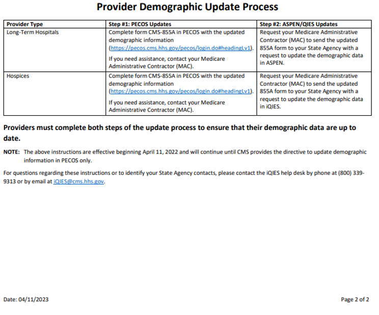 The referencing document that outlines the steps each PAC provider should follow has been updated. This version of the document contains a change in process for free-standing IRFs, LTCH, and Hospice providers when requesting updates to their demographic information in ASPEN or iQIES. The updated CMS 855A form must be sent by the Medicare Administrative Contractors (MACs) to the appropriate State Agency rather than to the CMS Location.