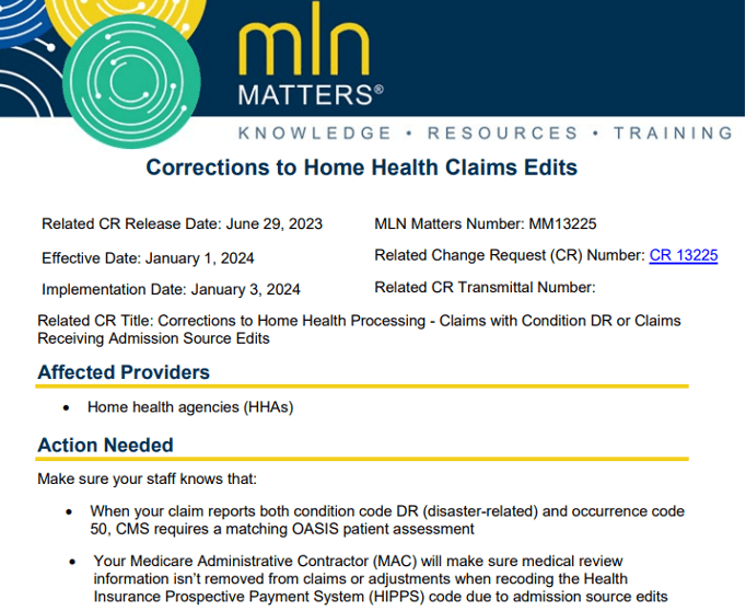 The purpose of CR 13225 (posted June 29, 2023) is to no longer bypass the edit requiring a matching patient assessment when a HH claim reports condition code DR and occurrence code 50. It also corrects processing of HH claims to ensure the medical review information isn’t lost if a reviewed claim later gets an admission source edit.