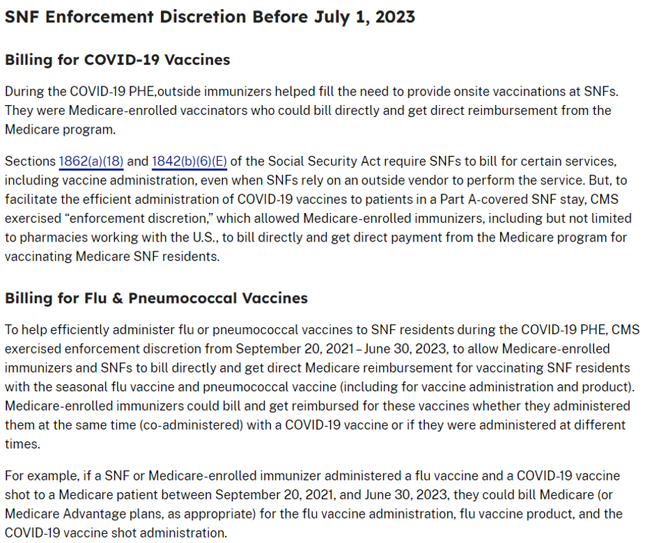 During the COVID-19 public health emergency, outside immunizers helped fill the need to provide onsite vaccinations at SNFs. This enforcement discretion related to certain pharmacy billing ended June 30, 2023