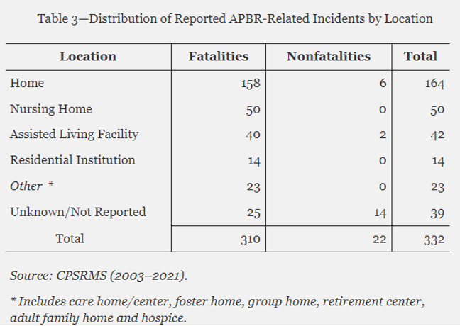 Approximately 50 percent of all APBR-related incidents and fatalities occurred at home. Other commonly reported locations included nursing homes, assisted living facilities, and residential institutions. Table 3 below shows the frequency of each location reported.