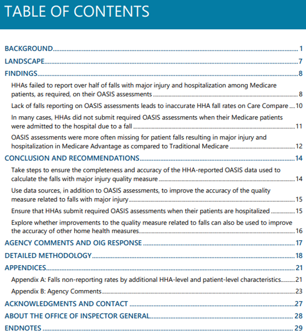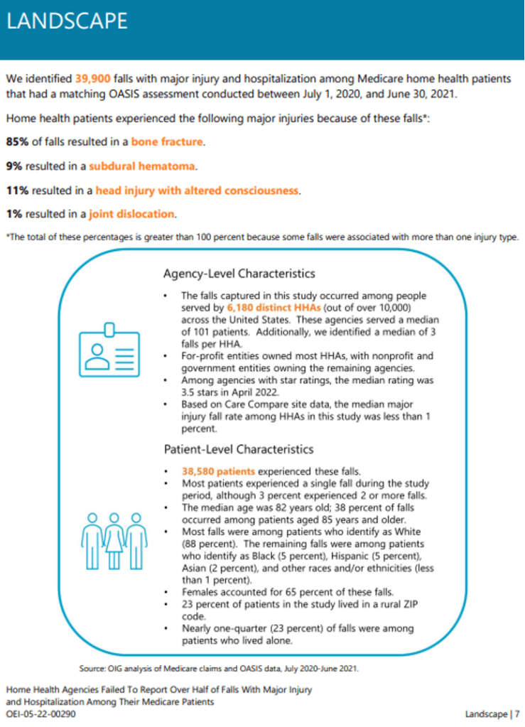 Starting in 2019, home health agencies (HHAs) were required to report that their patients experienced falls with major injury in patient Outcome Assessment Information Set (OASIS) assessments. The Centers for Medicare & Medicaid Services (CMS) uses this HHA-reported information to calculate major injury fall rates at the agency level. Beginning in 2022, CMS included these fall rates as one of the Care Compare website’s quality measures, which provide consumers with information about HHA performance. OIG and others have found problems with using provider-reported information to assess quality in the past. (OIG) conducted this study to determine the extent of falls reporting by HHAs and implications for the accuracy of the falls information on Care Compare.