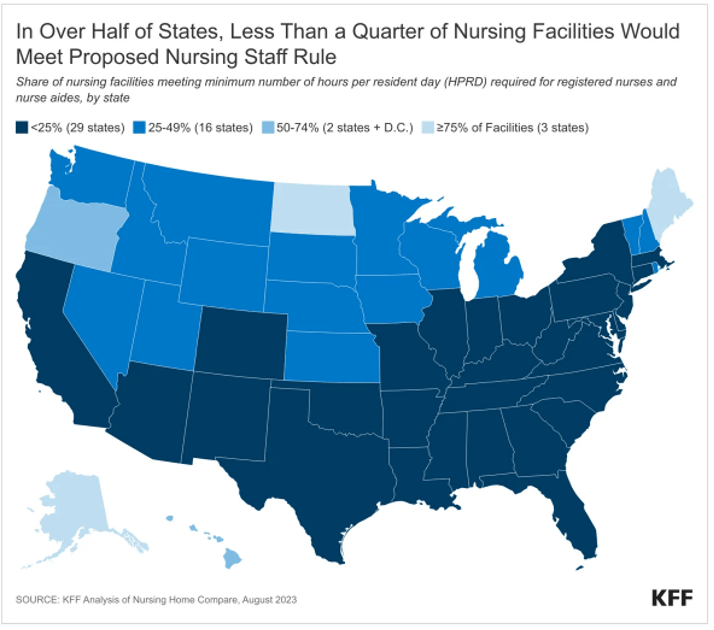 KFF’s analysis uses the most currently available data for both registered nurse and nurse aide hours from the Nursing Home Compare dataset, which includes 14,591 nursing facilities (97% of all facilities, serving 1.17 million or 98% of all residents) that reported their staffing levels in August 2023.”