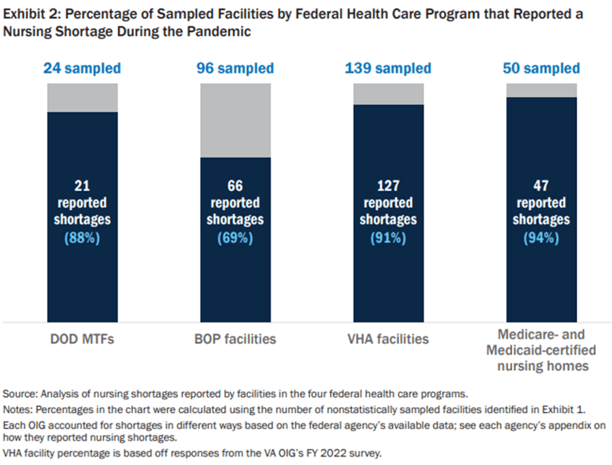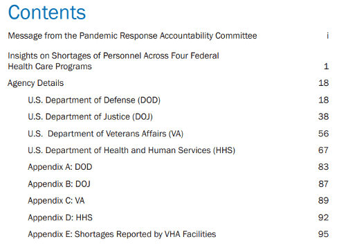 While personnel shortages existed in the health care community before the pandemic, the pandemic exacerbated these shortages. Maintaining an appropriate level of personnel in health care facilities is essential to providing a safe work environment for health care personnel and quality care to patients. The Pandemic Response Accountability Committee’s (PRAC) Health Care Subgroup developed this report to share insights into personnel shortages across four select federal health care programs, or the providers they reimburse (hereinafter referred to as “federal health care programs”). Together, these four programs provide health care services to approximately 20 million individuals.